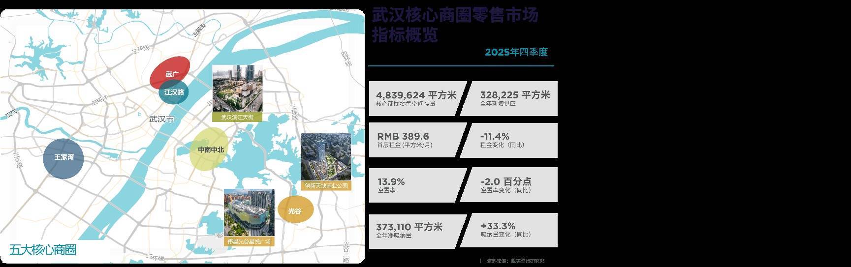 2025年武汉核心商圈优质零售市场迎来武汉滨江天街、光谷创新天地商业公园及伟星光谷星悦广场三大项目开业,合计新增优质零售空间约32.8万平方米,推动核心商圈零售市场总存量增至483.9万平方米。截至四季度末,市场首层平均租金为389.6元/平方米/月,同比下降11.4%;空置率同比下降2个百分点至13.9%;得益于新开业项目亮眼的招商率表现,全年核心商圈净吸纳量达37.3万平方米,同比上涨33.3%。
