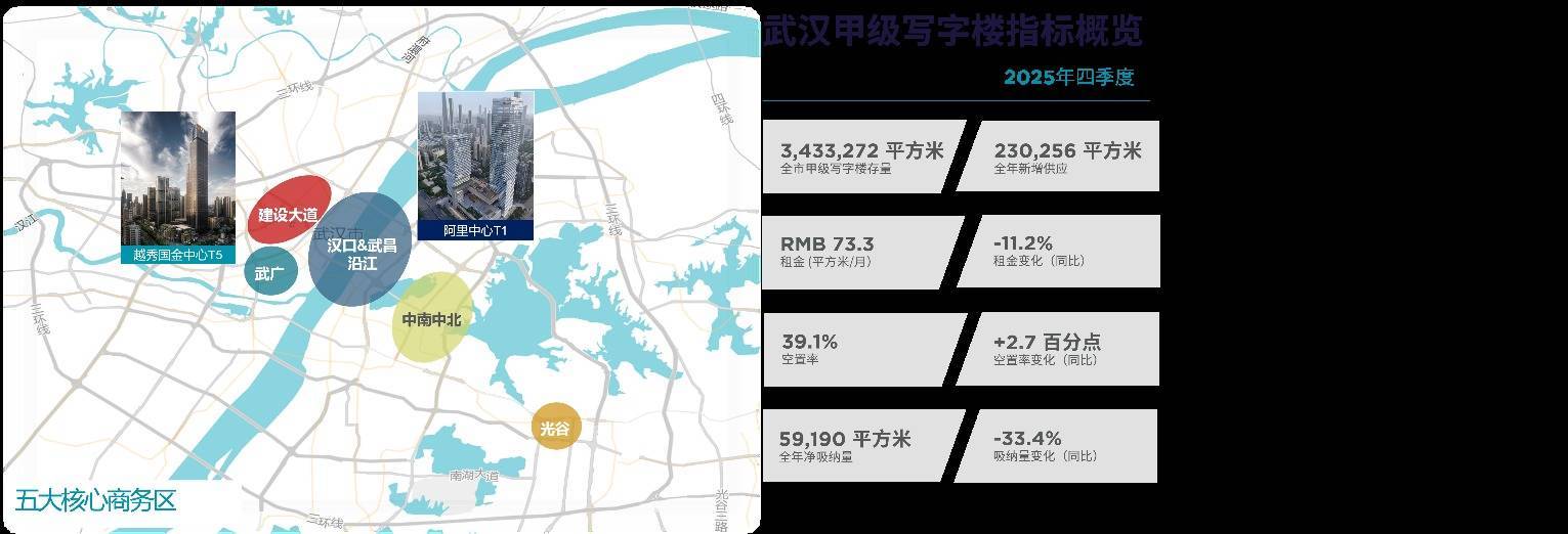 2025年武汉甲级写字楼市场迎来越秀国际金融中心T5与阿里中心T1两大优质项目交付,合计新增优质办公空间约23万平方米,推动全市核心商务区甲级写字楼总存量升至343.3万平方米。截至2025年四季度末,市场整体平均租金录得73.3元/平方米/月,同比下降11.2%;空置率攀升至39.1%,较去年同期上升2.7个百分点;全年核心商务区净吸纳量5.9万平方米,同比降幅达33.4%。
