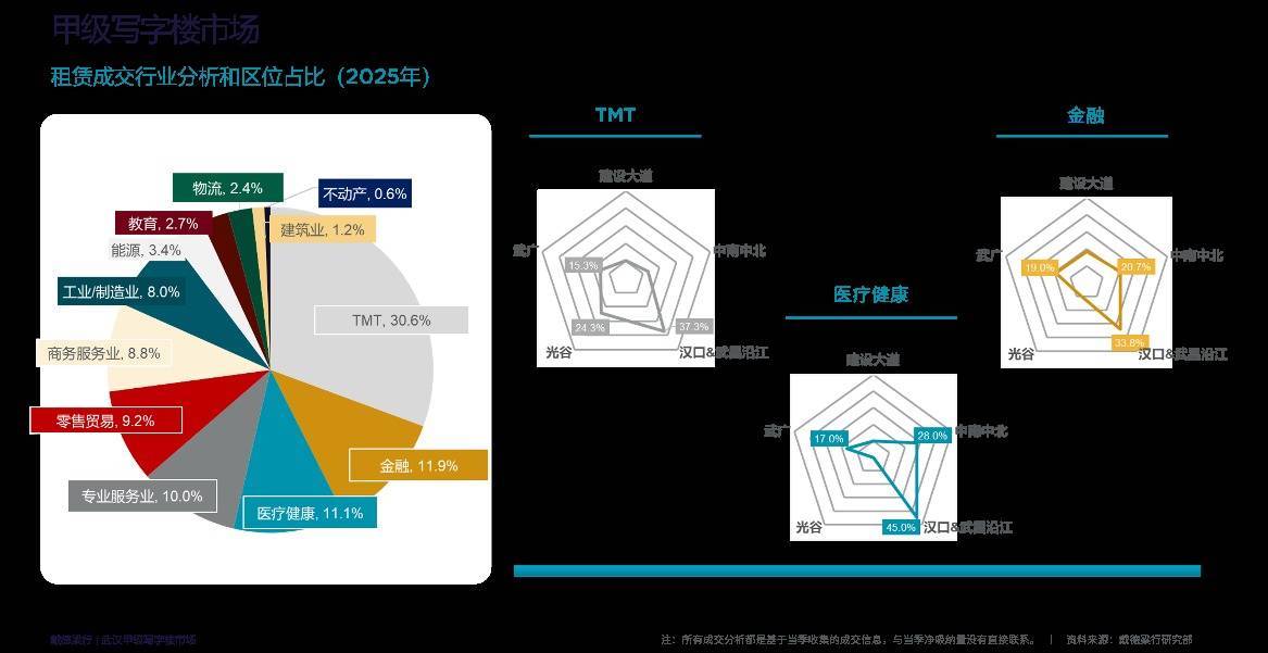 需求方面,TMT、金融和医疗健康为前三大成交行业,其中TMT占比30.6%。在新设需求中,TMT行业占35.9%,成为增量需求关键支撑。企业租赁仍以成本控制为导向,搬迁需求占比58.3%。面对供需失衡,业主积极通过空间改造、引入联合办公模式、提供定制化服务、精准招商及数字化运营等多重举措吸引客源,寻求破局之道。