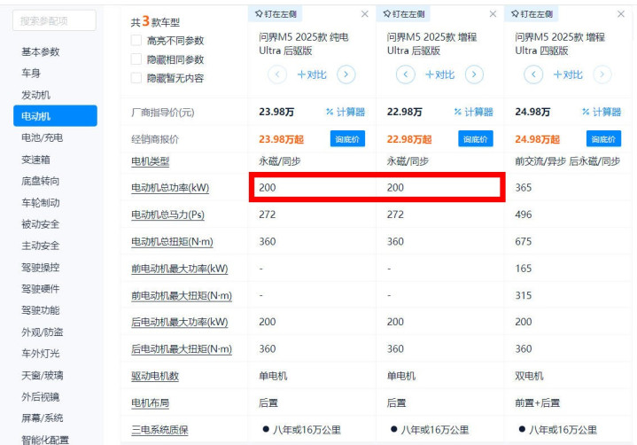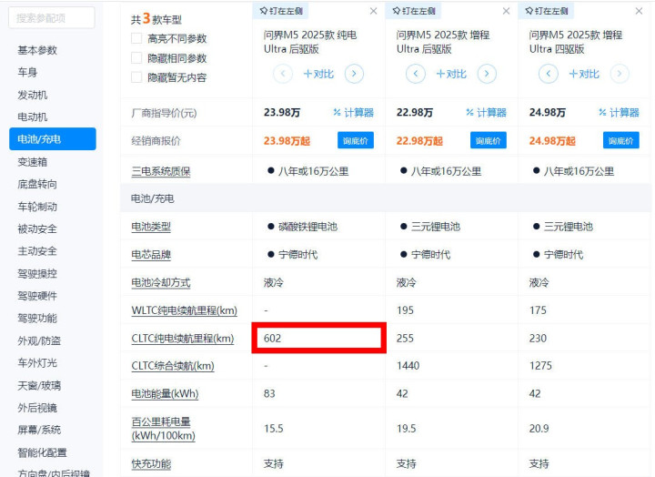 至于问界M5纯电版,则是提供最大功率为200kW的后置驱动电机,CLTC纯电续航里程最高为602km。