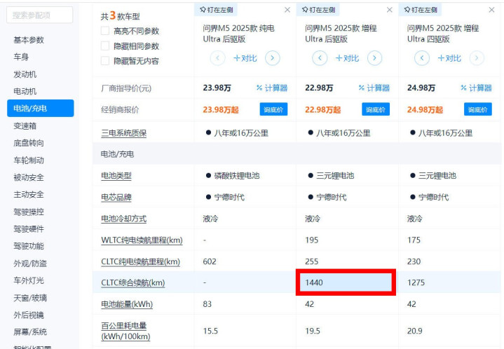 同样是对比问界M5,增程版匹配1.5T发动机作为增程器,最大功率为112kW,CLTC综合续航里程超1440km。