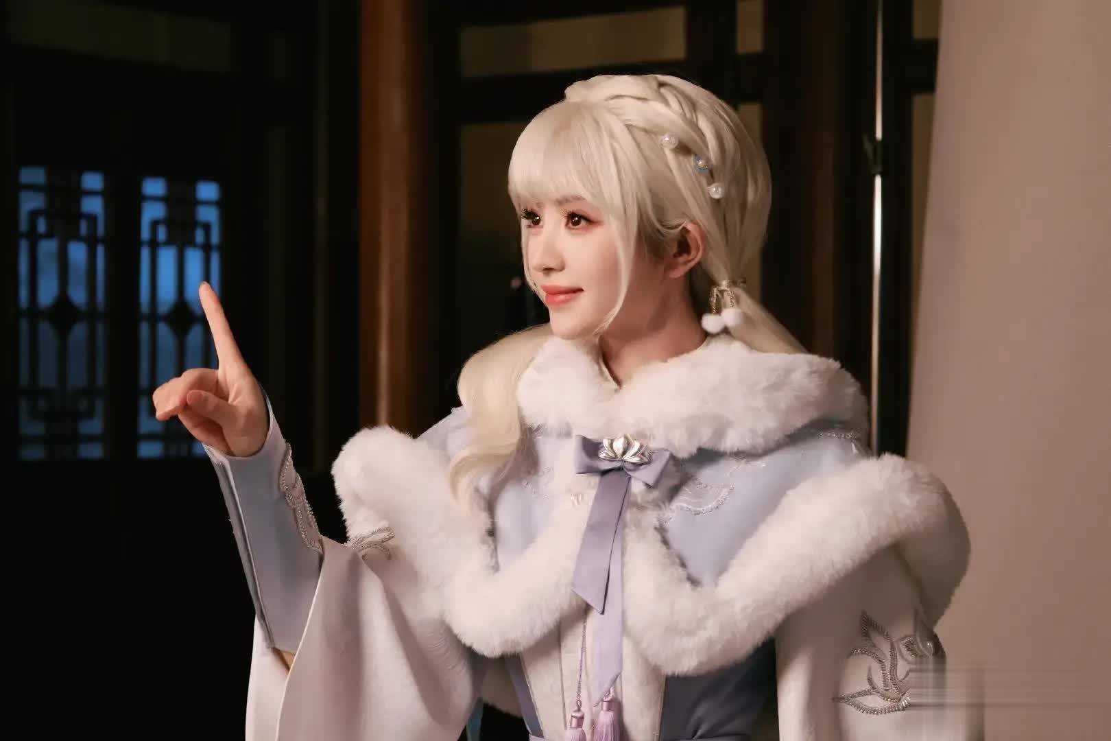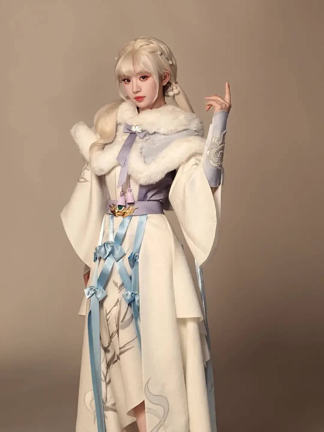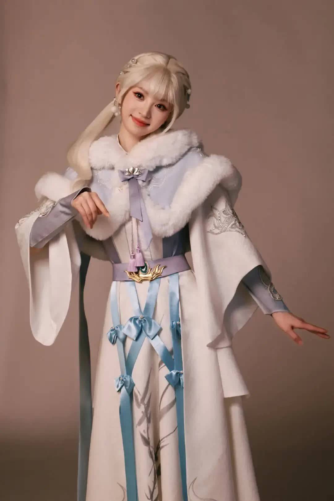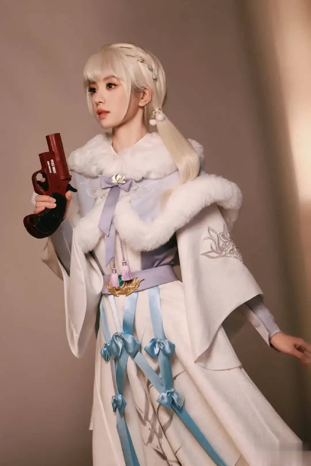 这组造型的灵感源于《和平精英》的虚拟角色设定,田曦薇以COS形式演绎了一位兼具甜美与战斗力的“甜酷狙击手”。她身穿古风白色长裙套装,外搭毛绒领斗篷,整体造型利落又不失少女感。妆容走极简裸感路线,弱化色彩却突出五官立体度。白发不仅衬得她肤白胜雪,更与灵动双马尾形成强烈反差,甜而不腻,飒而不冷。