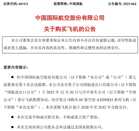 据民航观察观察,2025年年末,中国航司接连发布多笔飞机订单:中国国航购买60架空客A320neo系列飞机,春秋航空、吉祥航空分别购买30架和25架,华夏航空也订购了3架,另有中飞租赁订购30架。