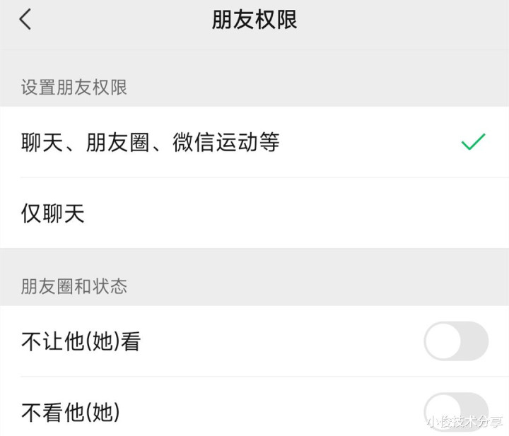 而新版则默认展示“聊天、朋友圈、微信运动等”权限,还新增了两个独立开关,能单独控制 “自己不看对方动态” 和 “不让对方看自己动态” ,底部依然保留“仅聊天”选项 。